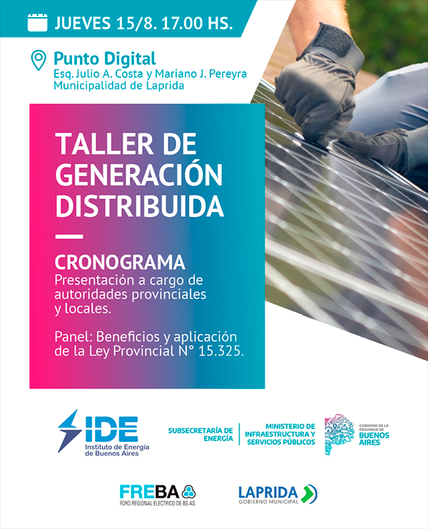 El Instituto de Energía de la Provincia de Buenos Aires (IDE), en conjunto con la Subsecretaría de Energía del Ministerio de Infraestructura y Servicios Públicos, el Foro Regional Eléctrico de la Provincia de Buenos Aires y la Municipalidad de Laprida, te invita a participar del Taller de Generación Distribuida. El evento se llevará a cabo el jueves 15 de agosto a las 17:00 horas en Punto Digital, ubicado en la esquina de Julio A. Costa y Mariano J. Pereyra, en el Municipio de Laprida.
